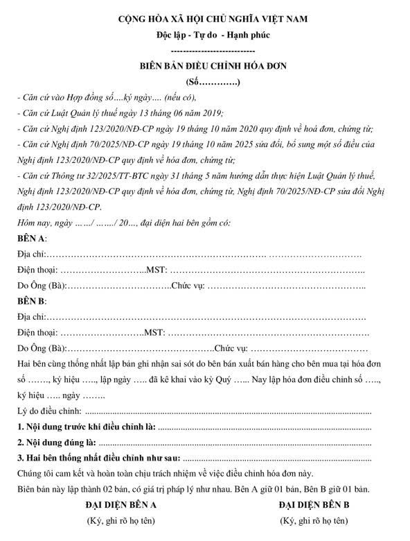 MẪU BIÊN BẢN ĐIỀU CHỈNH HÓA ĐƠN SAI SÓT THEO NGHỊ ĐỊNH 70/2025/NĐ-CP